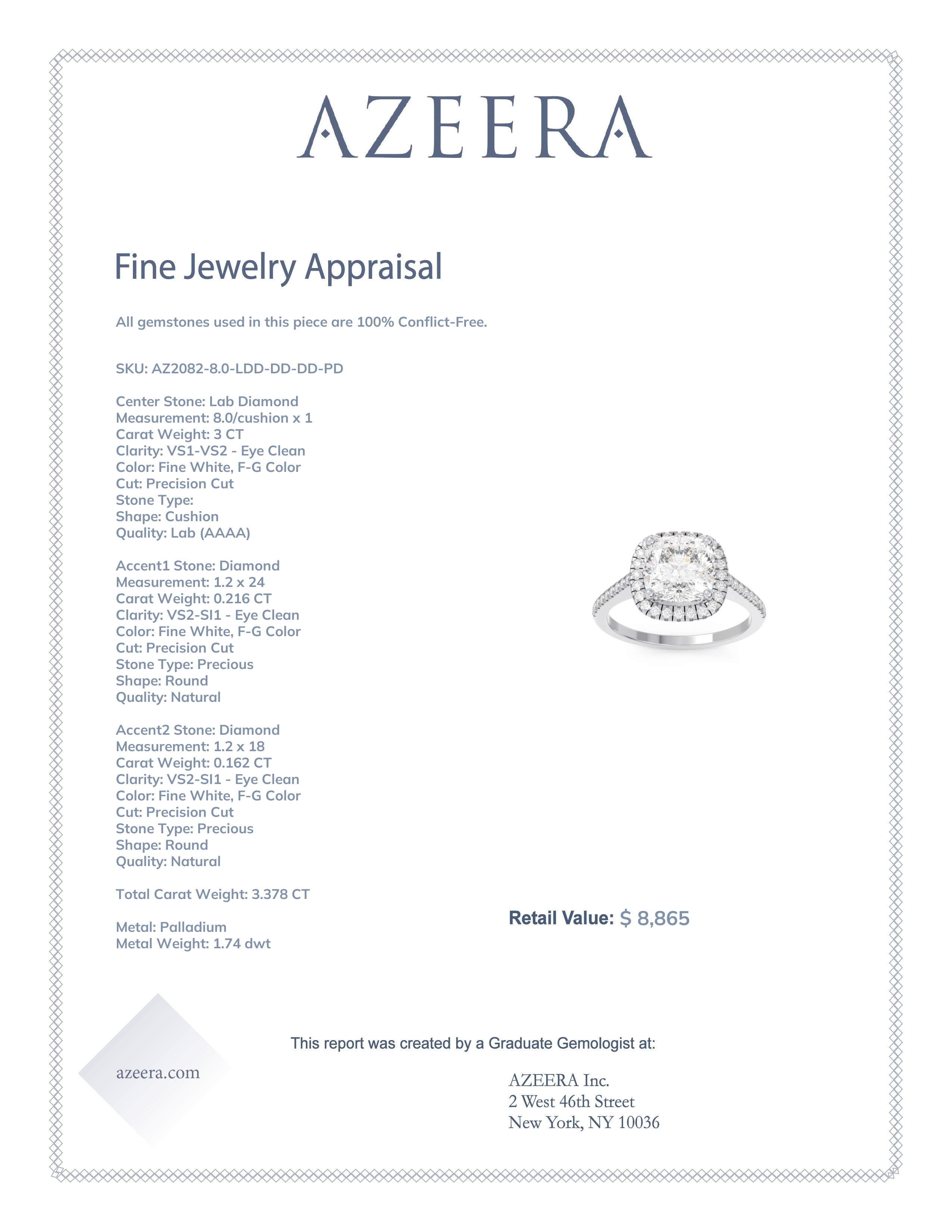 This Palladium Lab Diamond ring features a Cushion Lab Diamond, along with fine quality Diamond. This Ring Features A Large Cushion Cut Gem Accented with A Halo And Pave Around The Shank. We only use the top 10% of gems available, those found in the finest jewelry shops across the world. This Lab Diamond engagement ring can also be worn as an Lab Diamond and Diamond gemstone ring and added to your collection! Enjoy Free Shipping and Returns, Free Resize and a lifetime warranty.