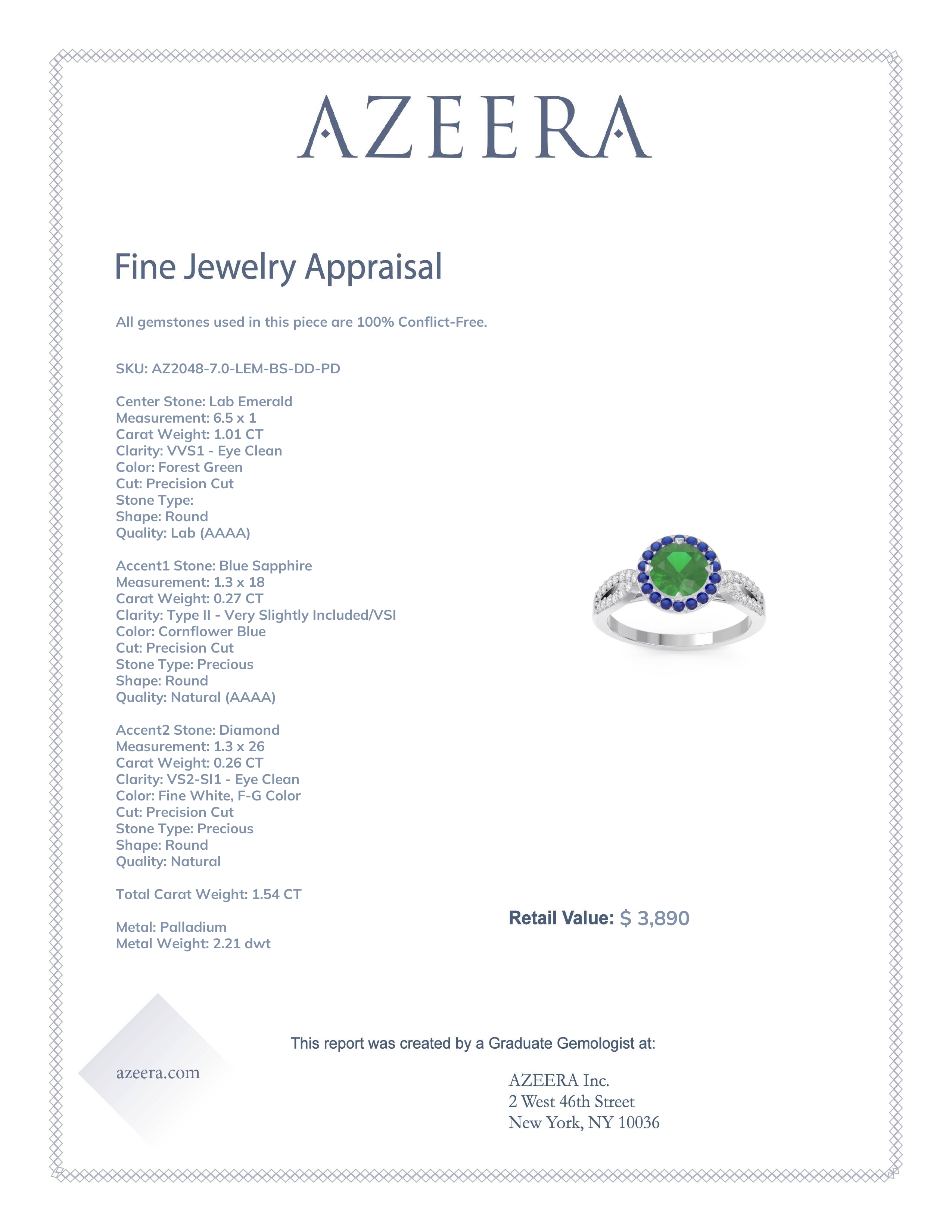 This Palladium Lab Emerald ring features a Round Lab Emerald, along with Blue Sapphire and Diamond. This Lab Emerald engagement ring can even be added to your collection of gemstone rings. Make this stunning Lab Emerald engagement ring your own. This Ring Features A Large Round Brilliant Gem Accented with A Halo And Pave Around A Loop Shaped Shank. This product comes with Free Shipping, Free Returns, Free Resize and a lifetime warranty. Choose your favorite metal and gem combination and experience the joy of customization.