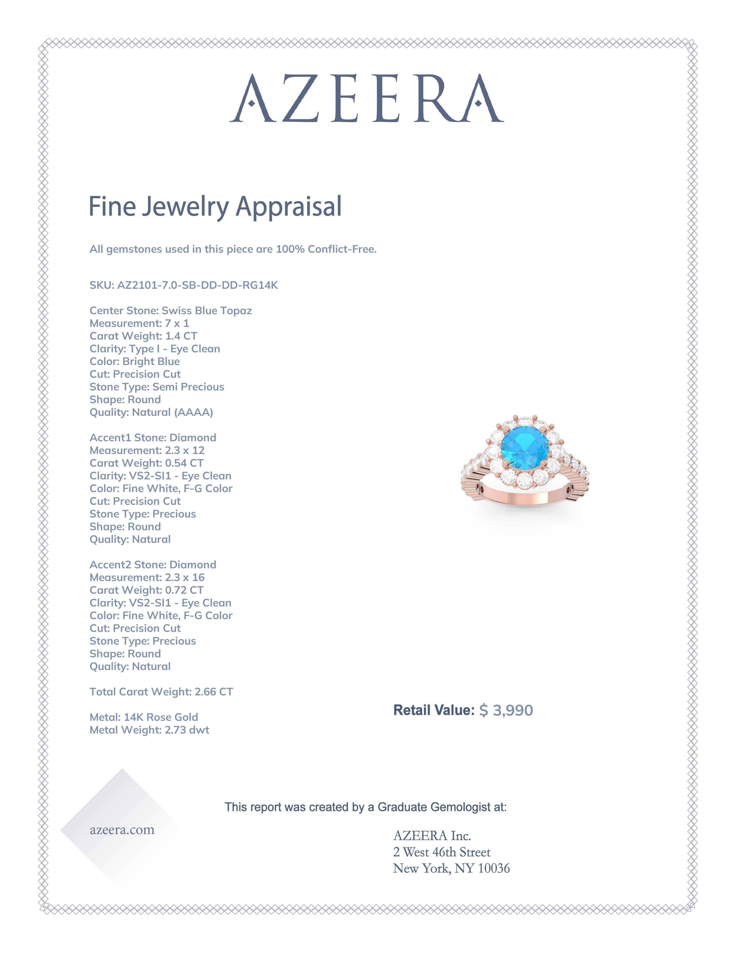 This 14K Rose Gold Swiss Blue Topaz ring features a Round Swiss Blue Topaz, along with fine quality Diamond. This Ring Features A Large Round Brilliant Gem Surrounded By A Halo Of Modest Round Brilliants. Smaller Rounds in A Pave Setting Also Cascade Three Quarters Of The Way Down Shank. We only use the top 10% of gems available, those found in the finest jewelry shops across the world. This Swiss Blue Topaz engagement ring can also be worn as an Swiss Blue Topaz and Diamond gemstone ring and added to your collection! Enjoy Free Shipping and Returns, Free Resize and a lifetime warranty.