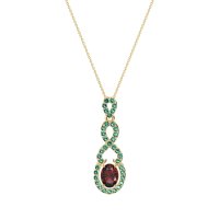 This Ruby and Emerald Necklace is casted in 14k Yellow Gold. This Women’s Fashion necklace features exceptionally fine gemstones, on par with those found in the world's most exclusive boutiques and among the top 10% available globally. This Pendant Features An Oval Stone Surrounded By A Halo That Seamlessly Transitions into An infinity Symbol. A Modern And Elegant Design. This necklace comes with a complimentary 18-inch chain. Enjoy the confidence of our 30-day, stress-free return policy—with return shipping fully covered. Each piece is also accompanied by a Lifetime Warranty, ensuring lasting beauty and peace of mind.