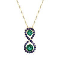 This Emerald and Blue Sapphire Necklace is casted in 14k Yellow Gold. This Women’s Fashion necklace features exceptionally fine gemstones, on par with those found in the world's most exclusive boutiques and among the top 10% available globally. Elegant Pendant with Two Central, Round-cut Stones And An infinity Halo Of Smaller Stones Around. Crafted in A Sleek Metal Setting, It Offers A Sophisticated Touch. This necklace comes with a complimentary 18-inch chain. Enjoy the confidence of our 30-day, stress-free return policy—with return shipping fully covered. Each piece is also accompanied by a Lifetime Warranty, ensuring lasting beauty and peace of mind.