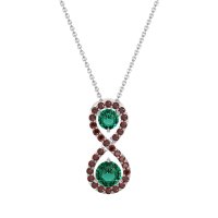 This Lab Emerald and Garnet Necklace is casted in Palladium. This Women’s Fashion necklace features exceptionally fine gemstones, on par with those found in the world's most exclusive boutiques and among the top 10% available globally. Elegant Pendant with Two Central, Round-cut Stones And An infinity Halo Of Smaller Stones Around. Crafted in A Sleek Metal Setting, It Offers A Sophisticated Touch. This necklace comes with a complimentary 18-inch chain. Enjoy the confidence of our 30-day, stress-free return policy—with return shipping fully covered. Each piece is also accompanied by a Lifetime Warranty, ensuring lasting beauty and peace of mind.