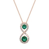 This Lab Emerald and Lab Diamond Necklace is casted in 14K Rose Gold. This Women’s Fashion necklace features exceptionally fine gemstones, on par with those found in the world's most exclusive boutiques and among the top 10% available globally. Elegant Pendant with Two Central, Round-cut Stones And An infinity Halo Of Smaller Stones Around. Crafted in A Sleek Metal Setting, It Offers A Sophisticated Touch. This necklace comes with a complimentary 18-inch chain. Enjoy the confidence of our 30-day, stress-free return policy—with return shipping fully covered. Each piece is also accompanied by a Lifetime Warranty, ensuring lasting beauty and peace of mind.