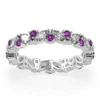 This Diamond wedding ring is casted in 18k White Gold and set with fine quality Diamond and Amethyst. All of the gemstones we use are of the top 10% available, those found in fine quality boutiques across the world. This Diamond wedding band can also be added to your collection of minimalist Diamond rings. This Eternity Band Consists Of Marquise And Round Gemstones Set Randomly Throughout The Ring. Free shipping, returns, resizing, and a lifetime warranty ensure you love your purchase.