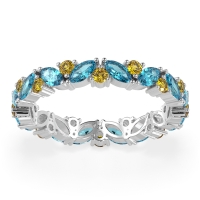 This Swiss Blue Topaz wedding ring is casted in Platinum and set with fine quality Swiss Blue Topaz and Citrine. All of the gemstones we use are of the top 10% available, those found in fine quality boutiques across the world. This Swiss Blue Topaz wedding band can also be added to your collection of minimalist Swiss Blue Topaz rings. This Eternity Band Consists Of Marquise And Round Gemstones Set Randomly Throughout The Ring. Free shipping, returns, resizing, and a lifetime warranty ensure you love your purchase.