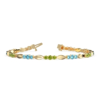 These 14k Yellow Gold bracelets feature fine quality Swiss Blue Topaz gemstones. This Fashion Bracelet Consists Of Marquise Shaped Links, with Alternating Links Of Graduated Three Stone Settings in Between. Free shipping, returns, and a lifetime warranty make luxury worry-free