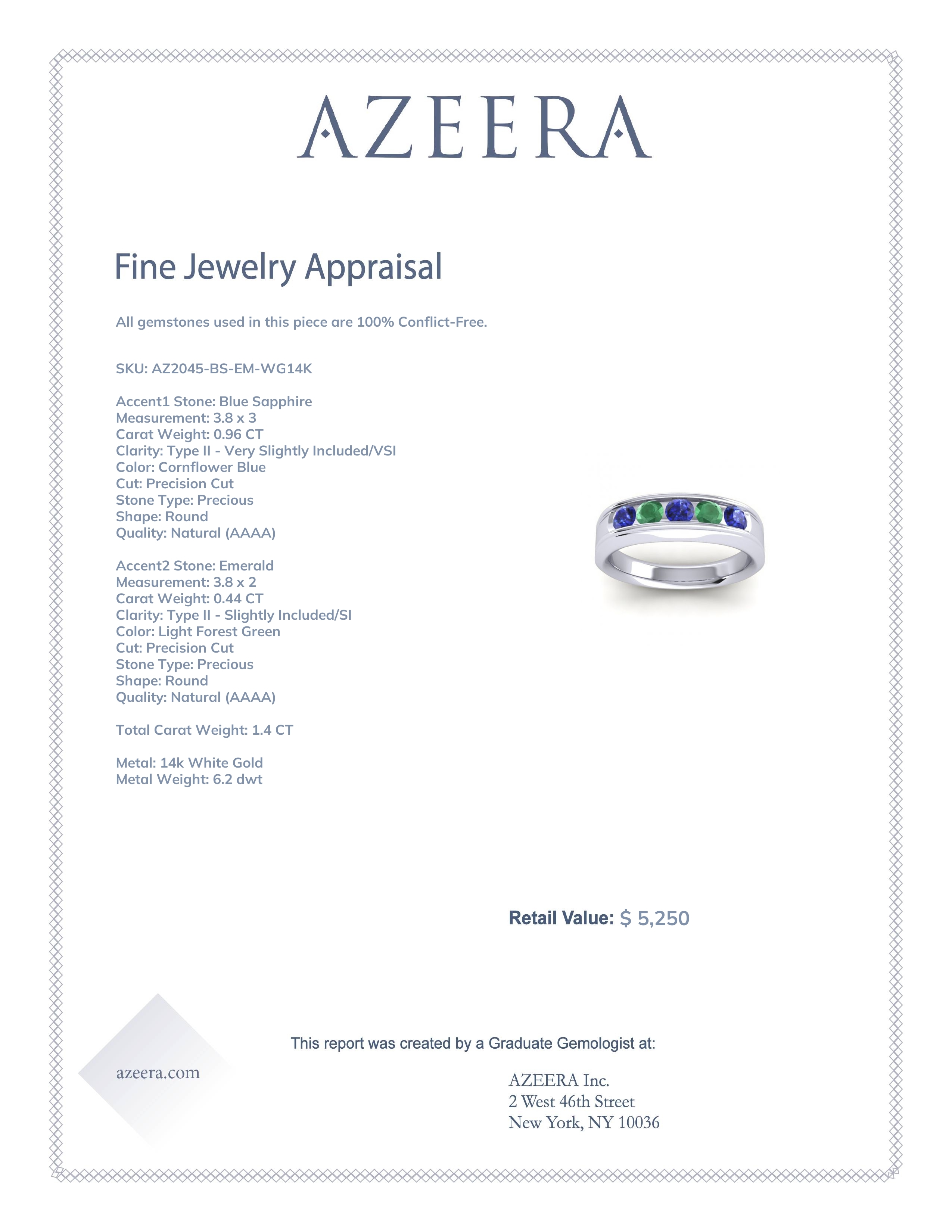 This mens Blue Sapphire ring features AAAA gemstones, along with fine quality Emerald. This mens 14k White Gold ring will stand the test of time, mirroring the bond it symbolizes. This Bold Ban Holds 5 Round Brilliant Gems Of Your Choice in A Channel Setting Securely Around The Center with A Flattened Face To Emphasize The Brilliance Of The Gems. Unique mens wedding bands say what words can't - about his style, his passions, his love. Choose from a variety of gems and metals to make custom rings for men! Free shipping, returns, resizing, and a lifetime warranty make choosing this product easy.