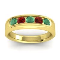 This mens Emerald ring features AAAA gemstones, along with fine quality Garnet. This mens 18k Yellow Gold ring will stand the test of time, mirroring the bond it symbolizes. This Bold Ban Holds 5 Round Brilliant Gems Of Your Choice in A Channel Setting Securely Around The Center with A Flattened Face To Emphasize The Brilliance Of The Gems. Unique mens wedding bands say what words can't - about his style, his passions, his love. Choose from a variety of gems and metals to make custom rings for men! Free shipping, returns, resizing, and a lifetime warranty make choosing this product easy.