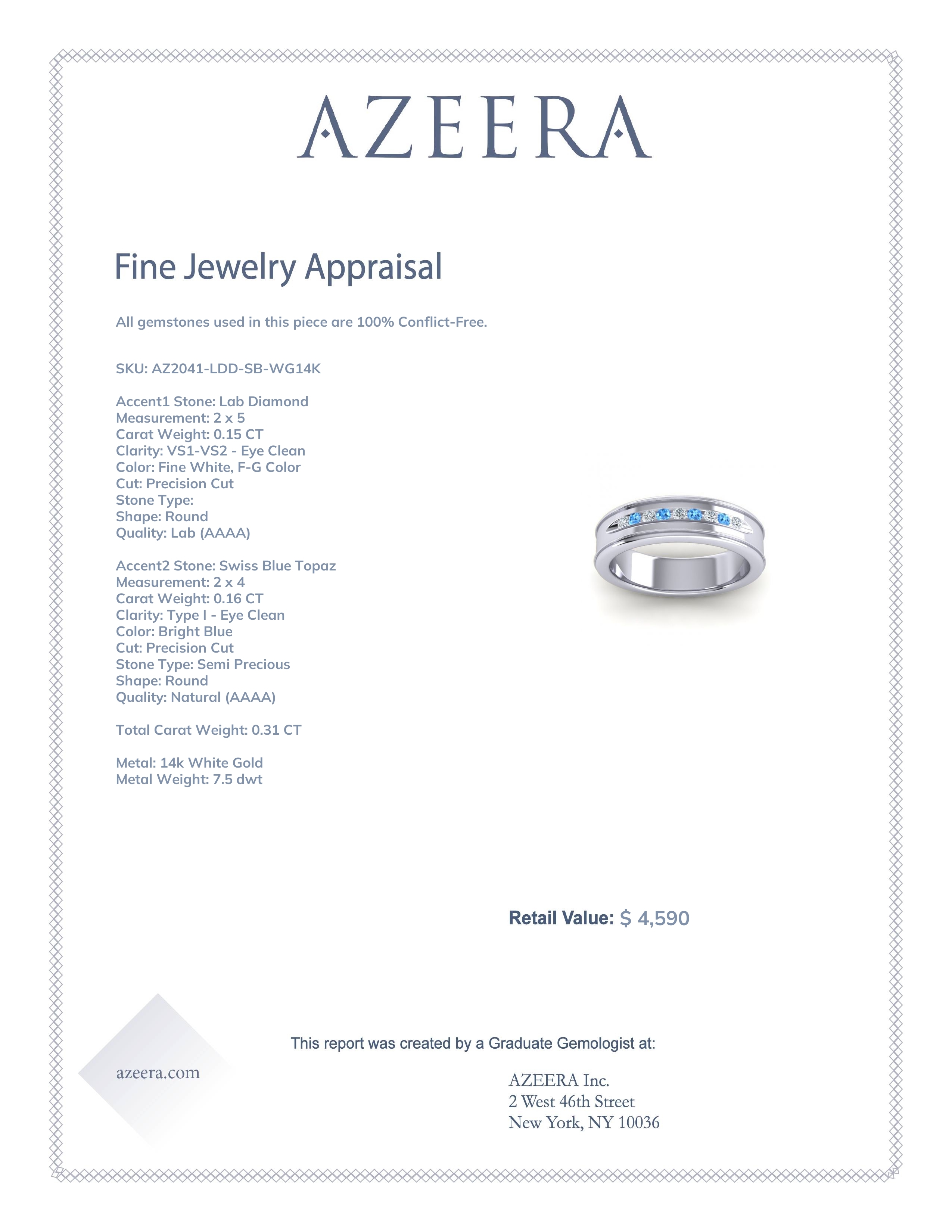 This mens Lab Diamond ring features AAAA gemstones, along with fine quality Swiss Blue Topaz. This mens 14k White Gold ring will stand the test of time, mirroring the bond it symbolizes. This Bold Band Holds 9 Channel Set Round Brilliant Gems Of Your Choice Around The Recessed Center Of The Ring with Raised Edges Giving The Ring A More Distinguished Appearance. Unique mens wedding bands say what words can't - about his style, his passions, his love. Choose from a variety of gems and metals to make custom rings for men! Free shipping, returns, resizing, and a lifetime warranty make choosing this product easy.