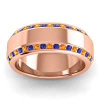 This mens Citrine ring features AAAA gemstones, along with fine quality Blue Sapphire. This mens 14K Rose Gold ring will stand the test of time, mirroring the bond it symbolizes. This Stunning Band Holds Two Rows Of Channel Set Round Brilliants On The Outer Edges Of The Upper Half Of The Ring. Unique mens wedding bands say what words can't - about his style, his passions, his love. Choose from a variety of gems and metals to make custom rings for men! Free shipping, returns, resizing, and a lifetime warranty make choosing this product easy.
