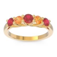 This Ruby wedding ring is casted in 14k Yellow Gold and set with fine quality Ruby and Citrine. All of the gemstones we use are of the top 10% available, those found in fine quality boutiques across the world. This Ruby wedding band can also be added to your collection of minimalist Ruby rings. This Band Features Five Small Round Brilliant Gems Tension Set On The Shank. Free shipping, returns, resizing, and a lifetime warranty ensure you love your purchase.