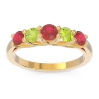 This Ruby wedding ring is casted in 18k Yellow Gold and set with fine quality Ruby and Peridot. All of the gemstones we use are of the top 10% available, those found in fine quality boutiques across the world. This Ruby wedding band can also be added to your collection of minimalist Ruby rings. This Band Features Five Small Round Brilliant Gems Tension Set On The Shank. Free shipping, returns, resizing, and a lifetime warranty ensure you love your purchase.