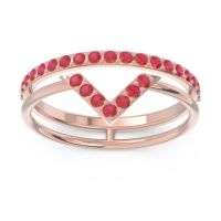 This 18K Rose Gold Ruby ring is the perfect addition to you collection of Fashion Rings. From boardroom to beach bonfire, this transcends the ordinary. This Ring Features A Double Line Design with Small Round Brilliant Gems in A V-shaped Shared Prong Setting On One Slender Shank And Small Round Brilliant Gems in A Shared Prong Setting Half Way Around The Other Slender Shank. Gone are the days of chunky statements and over-the-top sparkle. Today, people are gravitating towards the quiet confidence of minimalist jewelry. These pieces complement, rather than compete with, personal style, allowing individuality to shine through.