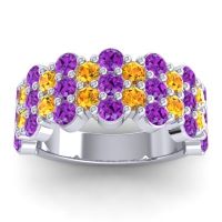 This Citrine wedding ring is casted in 14k White Gold and set with fine quality Citrine and Amethyst. All of the gemstones we use are of the top 10% available, those found in fine quality boutiques across the world. This Citrine wedding band can also be added to your collection of minimalist Citrine rings. This Contemporary Design Is Perfect For Those Who Love Color While Making A Statement. Your Round Colored Stones Sit in A Shared Prong Setting Across Half The Band in Four Honeycomb Style Rows. Free shipping, returns, resizing, and a lifetime warranty ensure you love your purchase.