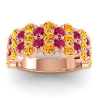 This Ruby wedding ring is casted in 18K Rose Gold and set with fine quality Ruby and Citrine. All of the gemstones we use are of the top 10% available, those found in fine quality boutiques across the world. This Ruby wedding band can also be added to your collection of minimalist Ruby rings. This Contemporary Design Is Perfect For Those Who Love Color While Making A Statement. Your Round Colored Stones Sit in A Shared Prong Setting Across Half The Band in Four Honeycomb Style Rows. Free shipping, returns, resizing, and a lifetime warranty ensure you love your purchase.