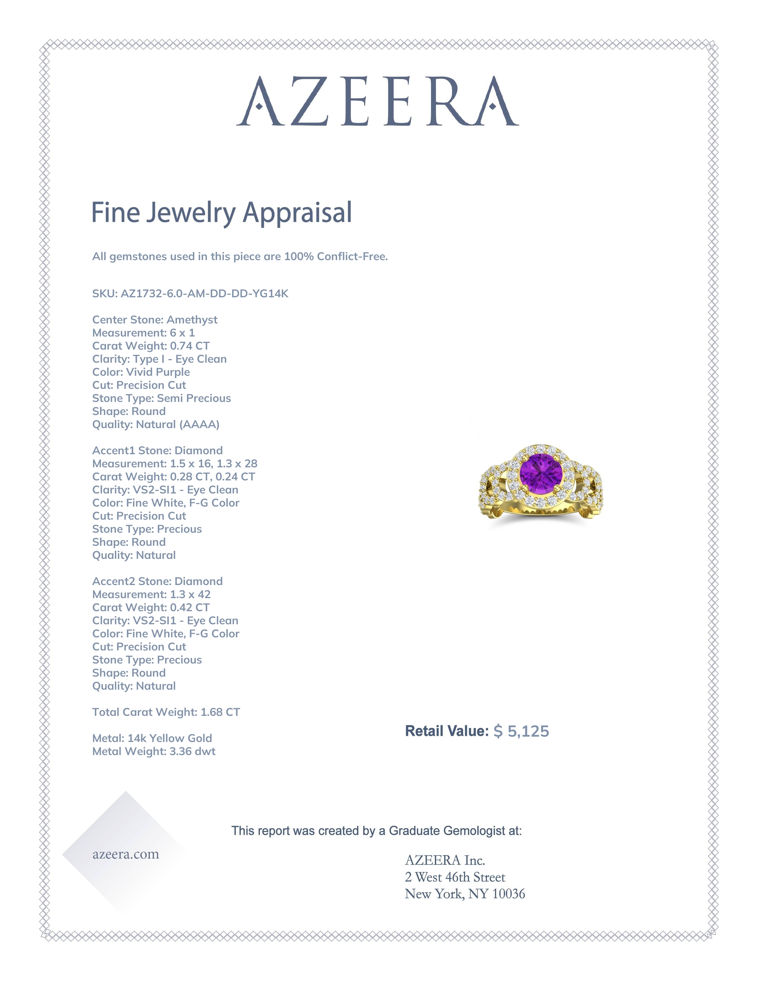 This 14k Yellow Gold Amethyst ring features a Round Amethyst, along with fine quality Diamond. This Elegant Ring Is Bold And Unique. Your Round Brilliant Gem Sits in A 4 Prong-setting Surround By A Halo Of Smaller Round Brilliant Gems. The Upper Half Of The Band Resembles Linked Chains And Is Accented with A Pave Of More Round Brilliant Gems. We only use the top 10% of gems available, those found in the finest jewelry shops across the world. This Amethyst engagement ring can also be worn as an Amethyst and Diamond gemstone ring and added to your collection! Enjoy Free Shipping and Returns, Free Resize and a lifetime warranty.