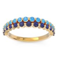 This Blue Sapphire wedding ring is casted in 18k Yellow Gold and set with fine quality Blue Sapphire and Swiss Blue Topaz. All of the gemstones we use are of the top 10% available, those found in fine quality boutiques across the world. This Blue Sapphire wedding band can also be added to your collection of minimalist Blue Sapphire rings. This Band Features Graduated Small Round Brilliants Gems Set in A Half Eternity Ring Around The Shank. Free shipping, returns, resizing, and a lifetime warranty ensure you love your purchase.