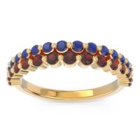This Garnet wedding ring is casted in 18k Yellow Gold and set with fine quality Garnet and Blue Sapphire. All of the gemstones we use are of the top 10% available, those found in fine quality boutiques across the world. This Garnet wedding band can also be added to your collection of minimalist Garnet rings. This Band Features Graduated Small Round Brilliants Gems Set in A Half Eternity Ring Around The Shank. Free shipping, returns, resizing, and a lifetime warranty ensure you love your purchase.