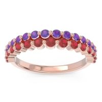 This Ruby wedding ring is casted in 14K Rose Gold and set with fine quality Ruby and Amethyst. All of the gemstones we use are of the top 10% available, those found in fine quality boutiques across the world. This Ruby wedding band can also be added to your collection of minimalist Ruby rings. This Band Features Graduated Small Round Brilliants Gems Set in A Half Eternity Ring Around The Shank. Free shipping, returns, resizing, and a lifetime warranty ensure you love your purchase.