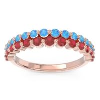 This Ruby wedding ring is casted in 18K Rose Gold and set with fine quality Ruby and Swiss Blue Topaz. All of the gemstones we use are of the top 10% available, those found in fine quality boutiques across the world. This Ruby wedding band can also be added to your collection of minimalist Ruby rings. This Band Features Graduated Small Round Brilliants Gems Set in A Half Eternity Ring Around The Shank. Free shipping, returns, resizing, and a lifetime warranty ensure you love your purchase.