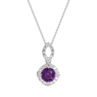 This Amethyst and Lab Diamond Necklace is casted in Palladium. This Women’s Halo necklace features exceptionally fine gemstones, on par with those found in the world's most exclusive boutiques and among the top 10% available globally. Modern Pendant Featuring A Central, Round Stone Surrounded By A Halo Of Smaller Stones. The Bail Is Also Embellished with Delicate Stone Accents. This necklace comes with a complimentary 18-inch chain. Enjoy the confidence of our 30-day, stress-free return policy—with return shipping fully covered. Each piece is also accompanied by a Lifetime Warranty, ensuring lasting beauty and peace of mind.