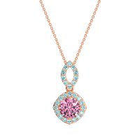 This Pink Tourmaline and Swiss Blue Topaz Necklace is casted in 14K Rose Gold. This Women’s Halo necklace features exceptionally fine gemstones, on par with those found in the world's most exclusive boutiques and among the top 10% available globally. Modern Pendant Featuring A Central, Round Stone Surrounded By A Halo Of Smaller Stones. The Bail Is Also Embellished with Delicate Stone Accents. This necklace comes with a complimentary 18-inch chain. Enjoy the confidence of our 30-day, stress-free return policy—with return shipping fully covered. Each piece is also accompanied by a Lifetime Warranty, ensuring lasting beauty and peace of mind.