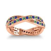 This Emerald wedding ring is casted in 14K Rose Gold and set with fine quality Emerald and Blue Sapphire. All of the gemstones we use are of the top 10% available, those found in fine quality boutiques across the world. This Emerald wedding band can also be added to your collection of minimalist Emerald rings. This Playful Design Is Both Secure And Stylish. Your Round Colored Stones Sit in A Shared 4 Prong Setting On Two Woven Strands Around The Band. Free shipping, returns, resizing, and a lifetime warranty ensure you love your purchase.