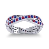 This Ruby wedding ring is casted in 18k White Gold and set with fine quality Ruby and Blue Sapphire. All of the gemstones we use are of the top 10% available, those found in fine quality boutiques across the world. This Ruby wedding band can also be added to your collection of minimalist Ruby rings. This Playful Design Is Both Secure And Stylish. Your Round Colored Stones Sit in A Shared 4 Prong Setting On Two Woven Strands Around The Band. Free shipping, returns, resizing, and a lifetime warranty ensure you love your purchase.