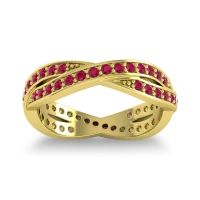 This Ruby wedding ring is set with AAAA Ruby, amongst the top 10% of material available. This ring can be casted in your choice of 9 metals. Ruby rings can be worn as gemstone wedding rings, or can even be stacked with your other gemstone rings. This Playful Design Is Both Secure And Stylish. Your Round Colored Stones Sit in A Shared 4 Prong Setting On Two Woven Strands Around The Band. Choose from a variety of gems and metals to make truly unique custom rings! Free shipping, returns, resizing, and a lifetime warranty make choosing this product easy.