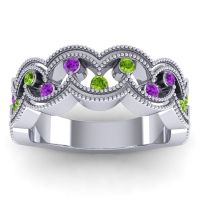 This Peridot wedding ring is casted in 18k White Gold and set with fine quality Peridot and Amethyst. All of the gemstones we use are of the top 10% available, those found in fine quality boutiques across the world. This Peridot wedding band can also be added to your collection of minimalist Peridot rings. This Unique Bands Uses Negative Space And Texture To Create A Captivating Design. Your Round Colored Stones Sit Suspended in A 2 Prong Setting Between To Wave Like Rows Of Precious Metal Accented with Milgrain. Free shipping, returns, resizing, and a lifetime warranty ensure you love your purchase.