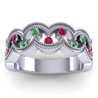 This Ruby wedding ring is casted in Palladium and set with fine quality Ruby and Emerald. All of the gemstones we use are of the top 10% available, those found in fine quality boutiques across the world. This Ruby wedding band can also be added to your collection of minimalist Ruby rings. This Unique Bands Uses Negative Space And Texture To Create A Captivating Design. Your Round Colored Stones Sit Suspended in A 2 Prong Setting Between To Wave Like Rows Of Precious Metal Accented with Milgrain. Free shipping, returns, resizing, and a lifetime warranty ensure you love your purchase.