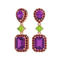 These 18K Rose Gold Amethyst earrings feature fine quality with Natural Amethyst, Peridot and Ruby gemstones. These Dangling Earrings Create A Spectacular Cascade Of Brilliance, Featuring A Harmonious Arrangement Of Three Distinct Gemstone Cuts. Each Earring Begins With A Radiant Pear-shaped Stone Framed By A Sparkling Halo At The Top, Followed By A Brilliant Princess-cut Stone Securely Prong-set In The Middle. The Design Culminates In A Stunning Emerald-cut Stone Gracefully Encircled By Its Own Dazzling Halo At The Bottom. This Intricate Multi-tier Design Ensures Breathtaking Movement And Unparalleled Sparkle With Every Turn. Free shipping, returns, and a lifetime warranty make luxury worry-free.