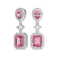 These Pink Tourmaline earrings and made in 18k White Gold with top quality Pink Tourmaline and Lab Diamond gemstones. These Dangling Earrings Create A Spectacular Cascade Of Brilliance, Featuring A Harmonious Arrangement Of Three Distinct Gemstone Cuts. Each Earring Begins With A Radiant Pear-shaped Stone Framed By A Sparkling Halo At The Top, Followed By A Brilliant Princess-cut Stone Securely Prong-set In The Middle. The Design Culminates In A Stunning Emerald-cut Stone Gracefully Encircled By Its Own Dazzling Halo At The Bottom. This Intricate Multi-tier Design Ensures Breathtaking Movement And Unparalleled Sparkle With Every Turn. Free shipping, returns, and a lifetime warranty make luxury worry-free