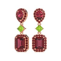 These Ruby earrings and made in 18K Rose Gold with top quality Natural Ruby and Peridot gemstones. These Dangling Earrings Create A Spectacular Cascade Of Brilliance, Featuring A Harmonious Arrangement Of Three Distinct Gemstone Cuts. Each Earring Begins With A Radiant Pear-shaped Stone Framed By A Sparkling Halo At The Top, Followed By A Brilliant Princess-cut Stone Securely Prong-set In The Middle. The Design Culminates In A Stunning Emerald-cut Stone Gracefully Encircled By Its Own Dazzling Halo At The Bottom. This Intricate Multi-tier Design Ensures Breathtaking Movement And Unparalleled Sparkle With Every Turn. Free shipping, returns, and a lifetime warranty make luxury worry-free