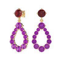 These Lab Ruby earrings and made in 18k Yellow Gold with top quality Lab Ruby and Amethyst gemstones. These Elegant Dangle Earrings Feature A Striking Open Pear-shaped Design, Meticulously Formed By A Cluster Of Sparkling Round Gems. A Single Larger Round Stone At The Top Initiates The Drop, Leading To The Beautifully Articulated Pear Outline. This Unique Arrangement Creates A Sophisticated Silhouette With Continuous Sparkle, Offering A Modern Twist On A Classic Shape. Free shipping, returns, and a lifetime warranty make luxury worry-free