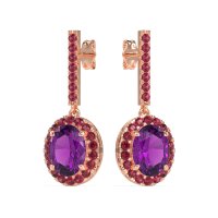 These Amethyst earrings and made in 18K Rose Gold with top quality Natural Amethyst and Ruby gemstones. Add Timeless Elegance To Your Ensemble With Our Oval Halo Drop Earrings. Featuring A Dazzling Oval-shaped Center Stone Surrounded By A Sparkling Halo, Each Earring Is Suspended From A Delicate Line Of Gemestones That Catches The Light With Every Movement. Free shipping, returns, and a lifetime warranty make luxury worry-free