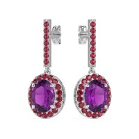 These Amethyst earrings and made in 18k White Gold with top quality Natural Amethyst and Ruby gemstones. Add Timeless Elegance To Your Ensemble With Our Oval Halo Drop Earrings. Featuring A Dazzling Oval-shaped Center Stone Surrounded By A Sparkling Halo, Each Earring Is Suspended From A Delicate Line Of Gemestones That Catches The Light With Every Movement. Free shipping, returns, and a lifetime warranty make luxury worry-free