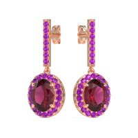 These Lab Ruby earrings and made in 18K Rose Gold with top quality Lab Ruby and Amethyst gemstones. Add Timeless Elegance To Your Ensemble With Our Oval Halo Drop Earrings. Featuring A Dazzling Oval-shaped Center Stone Surrounded By A Sparkling Halo, Each Earring Is Suspended From A Delicate Line Of Gemestones That Catches The Light With Every Movement. Free shipping, returns, and a lifetime warranty make luxury worry-free