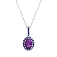 This Amethyst and Blue Sapphire Necklace is casted in 18k White Gold. This Women’s Halo necklace features exceptionally fine gemstones, on par with those found in the world's most exclusive boutiques and among the top 10% available globally. This Oval Halo Pendant Features A Central Oval Stones Surrounded By Smaller Gems To Form A Halo. The Bail Is Also Embellished with Sparkling Stones. This necklace comes with a complimentary 18-inch chain. Enjoy the confidence of our 30-day, stress-free return policy—with return shipping fully covered. Each piece is also accompanied by a Lifetime Warranty, ensuring lasting beauty and peace of mind.