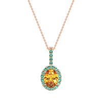 This Citrine and Emerald Necklace is casted in 14K Rose Gold. This Women’s Halo necklace features exceptionally fine gemstones, on par with those found in the world's most exclusive boutiques and among the top 10% available globally. This Oval Halo Pendant Features A Central Oval Stones Surrounded By Smaller Gems To Form A Halo. The Bail Is Also Embellished with Sparkling Stones. This necklace comes with a complimentary 18-inch chain. Enjoy the confidence of our 30-day, stress-free return policy—with return shipping fully covered. Each piece is also accompanied by a Lifetime Warranty, ensuring lasting beauty and peace of mind.