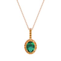 This Emerald and Citrine Necklace is casted in 14K Rose Gold. This Women’s Halo necklace features exceptionally fine gemstones, on par with those found in the world's most exclusive boutiques and among the top 10% available globally. This Oval Halo Pendant Features A Central Oval Stones Surrounded By Smaller Gems To Form A Halo. The Bail Is Also Embellished with Sparkling Stones. This necklace comes with a complimentary 18-inch chain. Enjoy the confidence of our 30-day, stress-free return policy—with return shipping fully covered. Each piece is also accompanied by a Lifetime Warranty, ensuring lasting beauty and peace of mind.