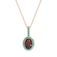 This Garnet and Emerald Necklace is casted in 14K Rose Gold. This Women’s Halo necklace features exceptionally fine gemstones, on par with those found in the world's most exclusive boutiques and among the top 10% available globally. This Oval Halo Pendant Features A Central Oval Stones Surrounded By Smaller Gems To Form A Halo. The Bail Is Also Embellished with Sparkling Stones. This necklace comes with a complimentary 18-inch chain. Enjoy the confidence of our 30-day, stress-free return policy—with return shipping fully covered. Each piece is also accompanied by a Lifetime Warranty, ensuring lasting beauty and peace of mind.