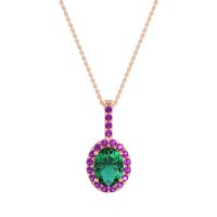 This Lab Emerald and Amethyst Necklace is casted in 14K Rose Gold. This Women’s Halo necklace features exceptionally fine gemstones, on par with those found in the world's most exclusive boutiques and among the top 10% available globally. This Oval Halo Pendant Features A Central Oval Stones Surrounded By Smaller Gems To Form A Halo. The Bail Is Also Embellished with Sparkling Stones. This necklace comes with a complimentary 18-inch chain. Enjoy the confidence of our 30-day, stress-free return policy—with return shipping fully covered. Each piece is also accompanied by a Lifetime Warranty, ensuring lasting beauty and peace of mind.