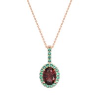 This Lab Ruby and Emerald Necklace is casted in 14K Rose Gold. This Women’s Halo necklace features exceptionally fine gemstones, on par with those found in the world's most exclusive boutiques and among the top 10% available globally. This Oval Halo Pendant Features A Central Oval Stones Surrounded By Smaller Gems To Form A Halo. The Bail Is Also Embellished with Sparkling Stones. This necklace comes with a complimentary 18-inch chain. Enjoy the confidence of our 30-day, stress-free return policy—with return shipping fully covered. Each piece is also accompanied by a Lifetime Warranty, ensuring lasting beauty and peace of mind.