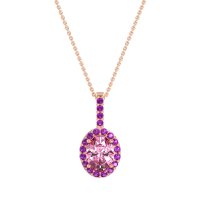 This Pink Tourmaline and Amethyst Necklace is casted in 14K Rose Gold. This Women’s Halo necklace features exceptionally fine gemstones, on par with those found in the world's most exclusive boutiques and among the top 10% available globally. This Oval Halo Pendant Features A Central Oval Stones Surrounded By Smaller Gems To Form A Halo. The Bail Is Also Embellished with Sparkling Stones. This necklace comes with a complimentary 18-inch chain. Enjoy the confidence of our 30-day, stress-free return policy—with return shipping fully covered. Each piece is also accompanied by a Lifetime Warranty, ensuring lasting beauty and peace of mind.