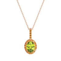 This Peridot and Citrine Necklace is casted in 14K Rose Gold. This Women’s Halo necklace features exceptionally fine gemstones, on par with those found in the world's most exclusive boutiques and among the top 10% available globally. This Oval Halo Pendant Features A Central Oval Stones Surrounded By Smaller Gems To Form A Halo. The Bail Is Also Embellished with Sparkling Stones. This necklace comes with a complimentary 18-inch chain. Enjoy the confidence of our 30-day, stress-free return policy—with return shipping fully covered. Each piece is also accompanied by a Lifetime Warranty, ensuring lasting beauty and peace of mind.