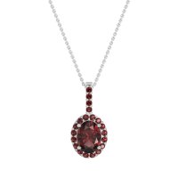 This Ruby Halo Necklace is casted in Palladium. We use only exceptionally fine gemstones, truly on par with those found in the world's most exclusive boutiques and representing the top 10% available globally. This Oval Halo Pendant Features A Central Oval Stones Surrounded By Smaller Gems To Form A Halo. The Bail Is Also Embellished with Sparkling Stones. You'll get a complimentary 18-inch chain with every necklace. Plus, enjoy a 30-day, hassle-free return policy (we even cover return shipping!) and a Lifetime Warranty for peace of mind.