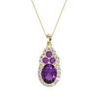 This Amethyst and Diamond Necklace is casted in 14k Yellow Gold. This Women’s Halo necklace features exceptionally fine gemstones, on par with those found in the world's most exclusive boutiques and among the top 10% available globally. Elegant Pendant Featuring An Oval Center Stone Embraced By A Halo Of Smaller Stones. Connected Directly Above Is A Cluster Of Three Stones, Adding A Graceful Accent. This necklace comes with a complimentary 18-inch chain. Enjoy the confidence of our 30-day, stress-free return policy—with return shipping fully covered. Each piece is also accompanied by a Lifetime Warranty, ensuring lasting beauty and peace of mind.