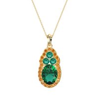 This Lab Emerald and Citrine Necklace is casted in 14k Yellow Gold. This Women’s Halo necklace features exceptionally fine gemstones, on par with those found in the world's most exclusive boutiques and among the top 10% available globally. Elegant Pendant Featuring An Oval Center Stone Embraced By A Halo Of Smaller Stones. Connected Directly Above Is A Cluster Of Three Stones, Adding A Graceful Accent. This necklace comes with a complimentary 18-inch chain. Enjoy the confidence of our 30-day, stress-free return policy—with return shipping fully covered. Each piece is also accompanied by a Lifetime Warranty, ensuring lasting beauty and peace of mind.