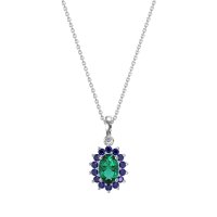 This Emerald and Blue Sapphire Necklace is casted in 14k White Gold. This Women’s Halo necklace features exceptionally fine gemstones, on par with those found in the world's most exclusive boutiques and among the top 10% available globally. Oval Pendant Featuring A Central Oval Stone Encircled By A Halo Of Smaller Round Stones. This necklace comes with a complimentary 18-inch chain. Enjoy the confidence of our 30-day, stress-free return policy—with return shipping fully covered. Each piece is also accompanied by a Lifetime Warranty, ensuring lasting beauty and peace of mind.